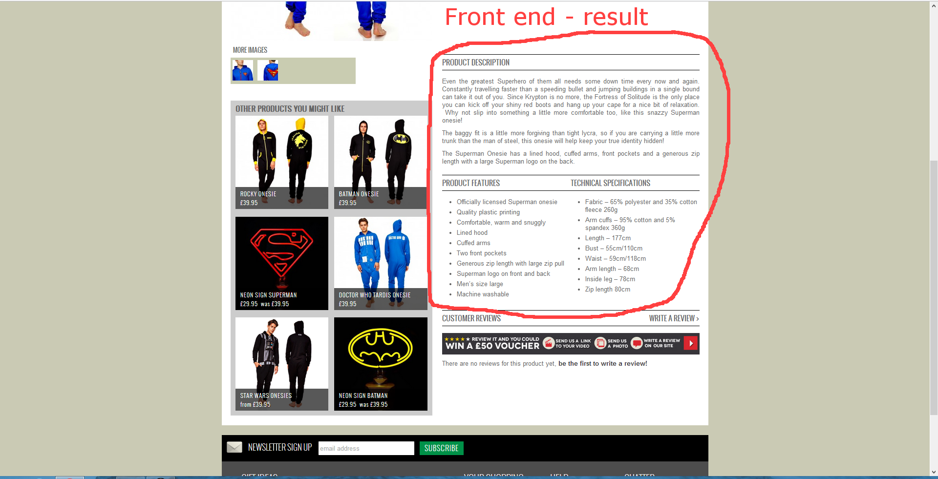 neoh Posted March 17, 2014 Author Share Posted March 17, 2014 (edited) 1. Added new columns to the table. Columns named product_features, box_contents and product_technical_specs. 2. classes/product.php - declared global variables /** @var string Product features*/ public $product_features; /** @var string Box contents*/ public $box_contents; /** @var string Product technical specs*/ public $product_technical_specs; - edited Lang fields in the $definition array /* Lang fields */ 'meta_description' => array('type' => self::TYPE_STRING, 'lang' => true, 'validate' => 'isGenericName', 'size' => 255), 'meta_keywords' => array('type' => self::TYPE_STRING, 'lang' => true, 'validate' => 'isGenericName', 'size' => 255), 'meta_title' => array('type' => self::TYPE_STRING, 'lang' => true, 'validate' => 'isGenericName', 'size' => 128), 'link_rewrite' => array('type' => self::TYPE_STRING, 'lang' => true, 'validate' => 'isLinkRewrite', 'required' => true, 'size' => 128), 'name' => array('type' => self::TYPE_STRING, 'lang' => true, 'validate' => 'isCatalogName', 'required' => true, 'size' => 128), 'description' => array('type' => self::TYPE_HTML, 'lang' => true, 'validate' => 'isCleanHtml'), 'description_short' => array('type' => self::TYPE_HTML, 'lang' => true, 'validate' => 'isCleanHtml'), 'product_features' => array('type' => self::TYPE_HTML, 'lang' => true, 'validate' => 'isCleanHtml'), 'box_contents' => array('type' => self::TYPE_HTML, 'lang' => true, 'validate' => 'isCleanHtml'), 'product_technical_specs' => array('type' => self::TYPE_HTML, 'lang' => true, 'validate' => 'isCleanHtml'), 'available_now' => array('type' => self::TYPE_STRING, 'lang' => true, 'validate' => 'isGenericName', 'size' => 255), 'available_later' => array('type' => self::TYPE_STRING, 'lang' => true, 'validate' => 'IsGenericName', 'size' => 255), 3. admin111/themes/default/template/controllers/products/informations.tpl - added three more rows to the table and coded that displays text editor in admin <tr><!-- Added by Matthew - Product features --> <td class="col-left"> {include file="controllers/products/multishop/checkbox.tpl" field="product_features" type="tinymce" multilang="true"} <label>{l s='Product features:'}<br /></label> <p class="product_description">({l s='Appears in the body of the product page'})</p> </td> <td style="padding-bottom:5px;"> {include file="controllers/products/textarea_lang.tpl" languages=$languages input_name='product_features' input_value=$product->product_features } <p class="clear"></p> </td> </tr> <tr> <!-- Added by Matthew - Box contents --> <td class="col-left"> {include file="controllers/products/multishop/checkbox.tpl" field="box_contents" type="tinymce" multilang="true"} <label>{l s='Box contents:'}<br /></label> <p class="product_description">({l s='Appears in the body of the product page'})</p> </td> <td style="padding-bottom:5px;"> {include file="controllers/products/textarea_lang.tpl" languages=$languages input_name='box_contents' input_value=$product->box_contents } <p class="clear"></p> </td> </tr> <tr> <!-- Added by Matthew - Product technical specs --> <td class="col-left"> {include file="controllers/products/multishop/checkbox.tpl" field="product_technical_specs" type="tinymce" multilang="true"} <label>{l s='Product technical specs:'}<br /></label> <p class="product_description">({l s='Appears in the body of the product page'})</p> </td> <td style="padding-bottom:5px;"> {include file="controllers/products/textarea_lang.tpl" languages=$languages input_name='product_technical_specs' input_value=$product->product_technical_specs } <p class="clear"></p> </td> /tr> 4. themes/default/product.tpl - added code to the template to display data {if isset($product) && $product->product_features}<h2 class="product_header">Product features</h2>{$product->product_features}{/if} {if isset($product) && $product->box_contents}<h2 class="product_header">Contents</h2>{$product->box_contents}{/if} {if isset($product) && $product->product_technical_specs}<h2 class="product_header">Technical specification</h2>{$product->product_technical_specs}{/if} Edited March 17, 2014 by neoh (see edit history) Link to comment Share on other sites More sharing options...