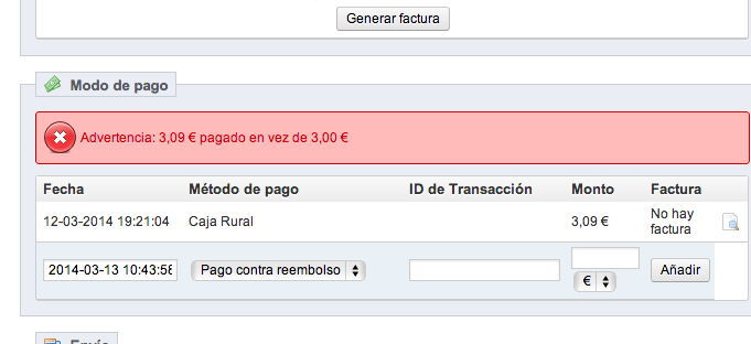 fbarata Posted March 13, 2014 Share Posted March 13, 2014 Hola, os agradeceria mucho si me pudierais echar una mano, he añadido la posibilidad de poner un recargo por pago con tarjeta en el TPV, todo va bien pero cuando entro en el backoffice me da un error en el cobro, no le gusta el incremento del recargo del 2% en el total: "Advertencia: 3,09 € pagado en vez de 3,00 €" No recoge bien el incremento del recargo. Adjunto tambien imagen. Este es el codigo: include(dirname(__FILE__).'/../../config/config.inc.php'); include(dirname(__FILE__).'/../../header.php'); include(dirname(__FILE__).'/cajarural.php'); $respuesta = ''; $total = ''; if (!empty($_GET)){ // Recoger datos de respuesta y limpiar $total = filter_input(INPUT_GET, 'importe', FILTER_SANITIZE_STRING); $pedido = filter_input(INPUT_GET, 'numpedido', FILTER_SANITIZE_STRING); $moneda = filter_input(INPUT_GET, 'moneda', FILTER_SANITIZE_STRING); $respuesta = filter_input(INPUT_GET, 'compra', FILTER_SANITIZE_STRING); $firma_remota = filter_input(INPUT_GET, 'firma', FILTER_SANITIZE_STRING); $fecha = filter_input(INPUT_GET, 'fecha', FILTER_SANITIZE_STRING); $rid_key = filter_input(INPUT_GET, 'key', FILTER_SANITIZE_STRING); $rid_cart = filter_input(INPUT_GET, 'id_cart', FILTER_SANITIZE_STRING); $rid_module = filter_input(INPUT_GET, 'id_module', FILTER_SANITIZE_STRING); $rid_order = filter_input(INPUT_GET, 'id_order', FILTER_SANITIZE_STRING); // Creamos objeto $cajarural = new cajarural(); //Verificamos opciones $error_pago = Configuration::get('CAJARURAL_ERROR_PAGO'); // Contraseña secreta $clave = Configuration::get('CAJARURAL_CLAVE'); // Calculo del SHA1 //comprobacion de la firma devuelta.. if ($respuesta=="si"){ $mensaje = "0" . $clave . $pedido . $total . $fecha; } elseif ($respuesta=="no"){ $mensaje = "1" . $clave . $pedido . $total . $fecha; } $firma_local = sha1($mensaje); if ($respuesta =="si"){ if ($firma_local == $firma_remota){ // Formatear variables // NINO - eliminar el punto de los miles para evitar error en pago // ORIGINAL - $total = number_format($total / 100,4); $total = number_format($total / 100,4,'.', ''); $pedido = substr($pedido,0,8); $pedido = intval($pedido); $moneda_tienda = 1; // Euros // Compra valida $mailvars=array(); $cajarural = new cajarural(); $cajarural->validateOrder($cart->id, _PS_OS_PAYMENT_, $total, $cajarural->displayName, NULL, $mailvars, NULL, false, $cart->secure_key); Tools::redirectLink('http://www.idealitas.es/store/modules/cajarural/pago_correcto.php?key='.$rid_key.'&id_cart='.$rid_cart.'&id_module='.$rid_module.'&id_order='.$rid_order); }else{ //Compra NO válida con firma remota Tools::redirectLink('http://www.idealitas.es/store/modules/cajarural/pago_error.php?key='.$rid_key.'&id_cart='.$rid_cart.'&id_module='.$rid_module.'&id_order='.$rid_order); } } else { //Compra NO válida SIN firma remota, puede retornar de ruralvia sin la firma remota, se redirecciona también a error para evitar una página en blanco. Tools::redirectLink('http://www.idealitas.es/store/modules/cajarural/pago_error.php?err=f&key='.$rid_key.'&id_cart='.$rid_cart.'&id_module='.$rid_module.'&id_order='.$rid_order); } } ?> Link to comment Share on other sites More sharing options...