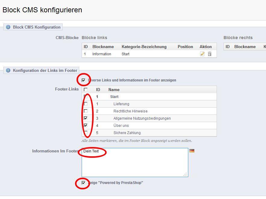 Whiley Posted March 14, 2014 Share Posted March 14, 2014 (edited) Hallo WWacker, Unter Informationen will ich einige Links löschen, während ich andere einfügen möchte. Einen Teil der Einträge unter "Informationen wird über den CMS Block gesteuert, du kannst unter BO -->Voreinstellungen -->CMS neue Beiträge erstellen, editieren etc. Ob die Beiträge im Footer angezeigt werden stellst du ein unter: BO -->Module --> Block CMS -->konfigurieren Hier könntest du auch dein Copyright unterbringen Wie man die anderen Beiträge ändern bzw entfernen kann habe ich u.a. hier oder hier schon mal beschrieben Ganz löschen möchte ich "Mobilseite durchsuchen" (Ganz unten) Unter BO-->Templates &Vorlagen -->default kannst du diesen Punkt deaktivieren. Grüsse Whiley Edited March 14, 2014 by Whiley (see edit history) Link to comment Share on other sites More sharing options...
