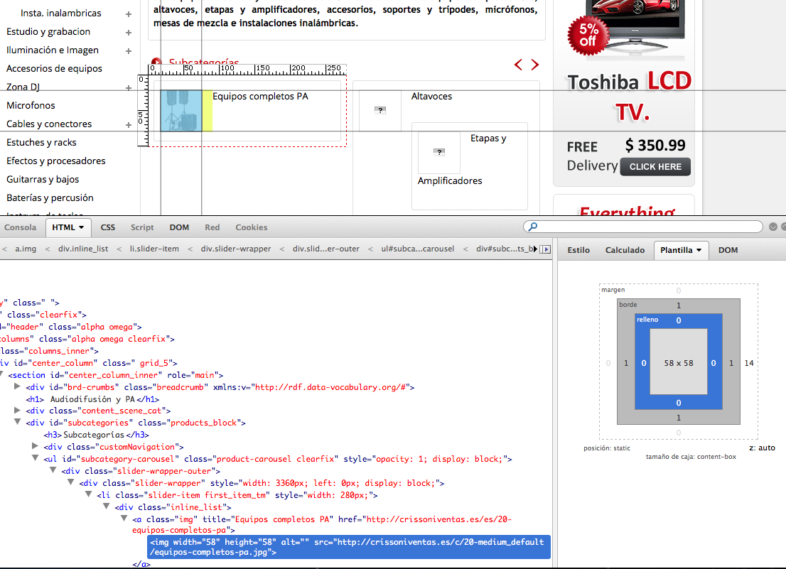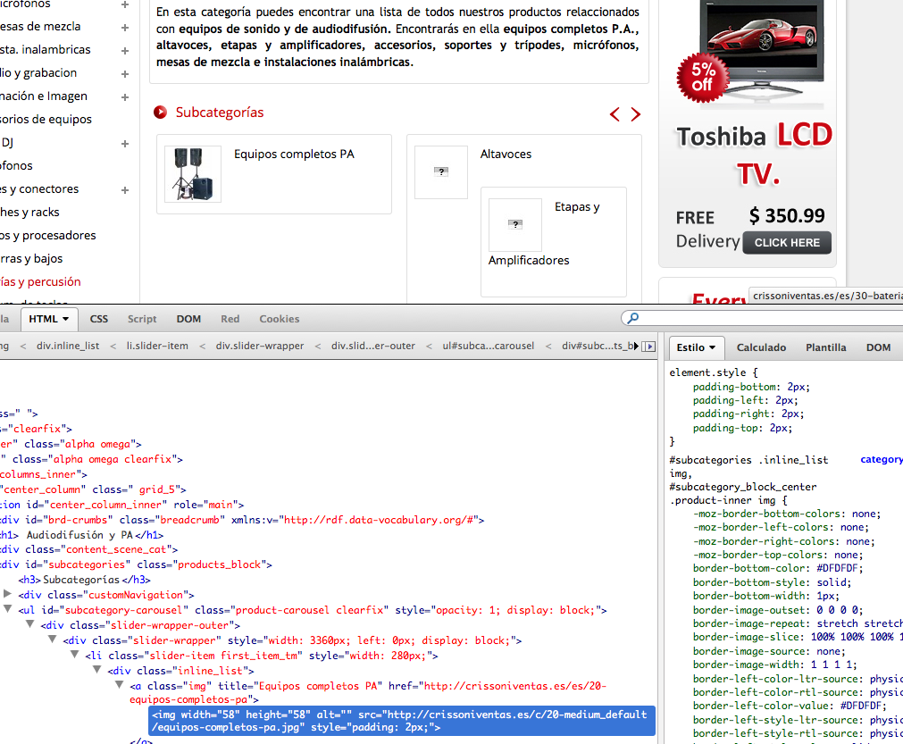 bocomu Posted March 14, 2014 Share Posted March 14, 2014 Hola, os explico, antes de nada deciros que se trata de un problema que me ha surgido en el Theme PRS020027. Se trata de que quiero añadir dos pixeles de relleno, a las imágenes que aparecen en las subcategorías del Theme, pues si no ocurre que las tapa el borde y queda un efecto muy feo. Os adjunto las imágenes para que lo veáis. Se me generan element.style, lo cual quiere decir que tengo que modificar código html, pero no se localizarlo a ver si me podéis ayudar. Así es como me salen las imágenes: Así es como quiero que queden: El relleno en firebug: Los element style que me genera: Espero vuestra respuesta, un saludo. Link to comment Share on other sites More sharing options...