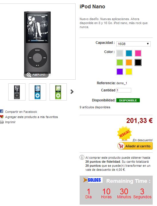 rainbows7 Posted March 14, 2014 Author Share Posted March 14, 2014 Tienes un aporte disponible para ello http://www.prestashop.com/forums/topic/296511-aporte-cronometro-de-oferta-personalizaci%C3%B3n/ Luego ya solo tendras que crear un precio especifico y editar su disponibilidad Hola no se que hago mal.Pero en mi producto no me hace la cuenta atras.Un saludo. Link to comment Share on other sites More sharing options...
