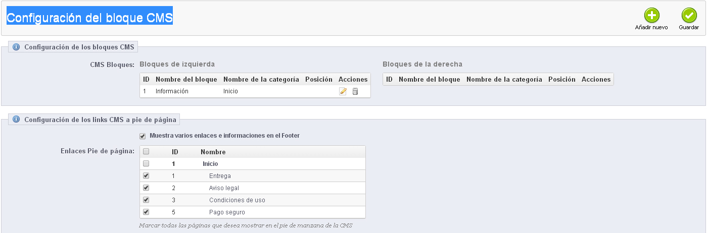 pegasus6464 Posted March 16, 2014 Share Posted March 16, 2014 (edited) Buenas noches a todos! Queria comentaros un tema, en mi pie de la pagina tengo un bloque que me muestra lo siguiente: Customer Service Entrega Aviso legal Condiciones de uso Pago seguro Información Promociones especiales Novedades Mejores ventas Nuestras tiendas Contacte con nosotros Mapa del sitio Mi cuenta Mis pedidos Mis vales descuento Mis direcciones Mis datos personales Contacte con nosotros Pues bien si voy al modulo Configuración del bloque CMS solo me sale para editar un bloque a la izquierda, que es el de Entrega, aviso legal. ... tal y como lo muestro en la segunda captura, donde puedo editar los otros bloques que estan a la derecha y borrar elementos? Por ejemplo borrar Mapa del Sitio y Mejores ventas (tengo el modulo desactivado de mejores ventas pero sigue apareciendo eso ahi y desde el bloque cms tampoco lo pude quitar) GRACIAS! Edited March 16, 2014 by pegasus6464 (see edit history) Link to comment Share on other sites More sharing options...