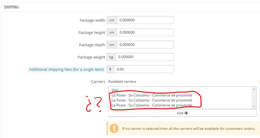 w3bsolutions Posted March 17, 2014 Share Posted March 17, 2014 (edited) After the update to 1.6.0.5 all the sudden there is a strange carrier called "La Poste - So Colissimo - Commerce de proximité" that shows up on my list of "Available carriers" on the "Shipping" tab of every product on the backoffice. I have no such carrier created and I don't even have the socolissimo module installed. Why did this appear with the update? How can I get rid of it? Attached is the screenshot. Edit: I just removed them from the database since the BO didn't let me delete them. Edited November 2, 2014 by fire2 (see edit history) Link to comment Share on other sites More sharing options...