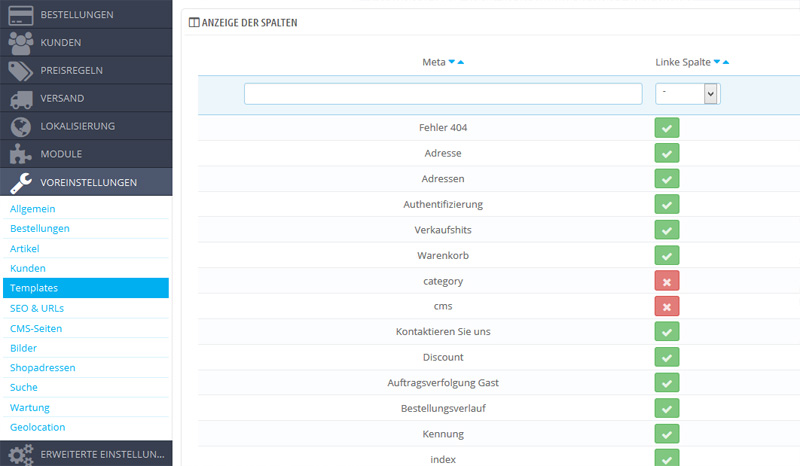 Die Sidebars (linke und rechte Spalte) können ja jetzt direkt in den Voreinstellungen der Templates konfiguriert werden. Dafür wurde (sofern ich es richtig verstanden habe) die Datenbankstuktur um die Tabellen "ps_theme_meta" erweitert. Allerdings habe ich drei Meta-Einträge, bei denen ich die Spalten nicht aktivieren kann (auch im neuen Standard-Theme). Ich bekomme immer die Fehlermeldung "Beim Update dieses Metatags ist ein Fehler aufgetreten" zurück. Die besagten Meta-Angaben sind "category", "cms" und "product".