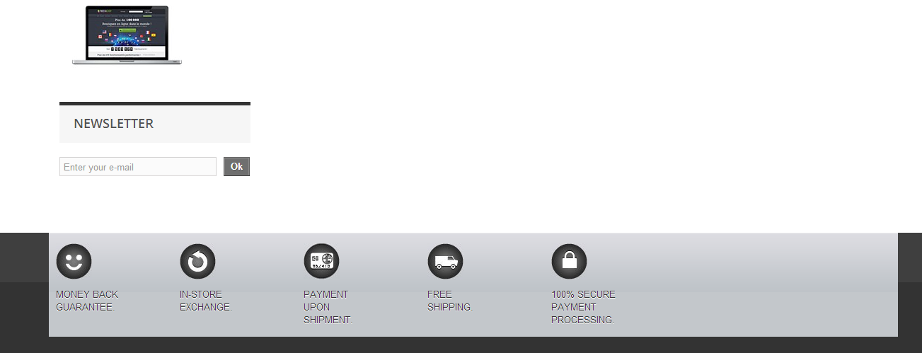 kellerkelly Posted March 18, 2014 Share Posted March 18, 2014 Hi, as the title suggest i need some help how do i remove the bar at the bottom of my home page www.bashment-prices.co.uk i'm talking about the bar that has Money back guarantee,in-store exchange, Payment upon shipment & free shipping. Also when i upgraded to prestashop 1.6 i never got the boxes on the home page like in the demo that was one off the reason for upgrading Link to comment Share on other sites More sharing options...