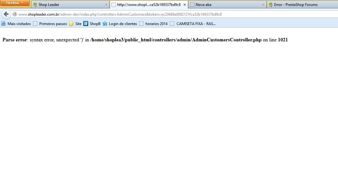 welison14 Posted March 19, 2014 Share Posted March 19, 2014 when I access the clients tab this error appears Parse error: syntax error, unexpected ')' in /home/shoplea3/public_html/controllers/admin/AdminCustomersController.php on line 1021 Link to comment Share on other sites More sharing options...