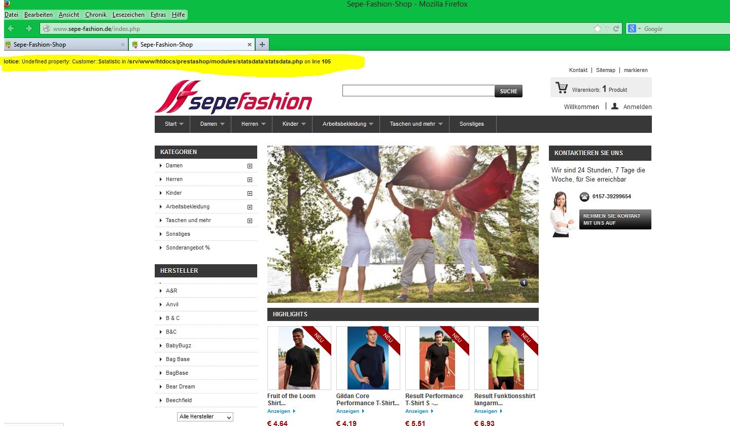 barsik1111 Posted March 19, 2014 Share Posted March 19, 2014 (edited) Guten Tag,ich habe in meinem Shop 1.5.6.2 Modul germaNext 1.5.4 installiertEs kommt jetzt Fehlermeldung:Notice: Undefined property: Customer::$statistic in /srv/www/htdocs/prestashop/modules/statsdata/statsdata.php on line 105und nach dem ich Modul aktiviert habe wird Zahlungsmetode Banküberweisung nicht mehr angezeigtVielen Dank Edited March 23, 2014 by barsik1111 (see edit history) Link to comment Share on other sites More sharing options...