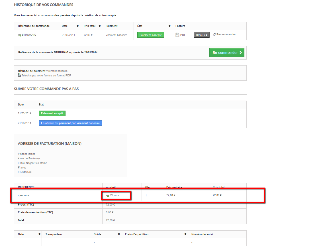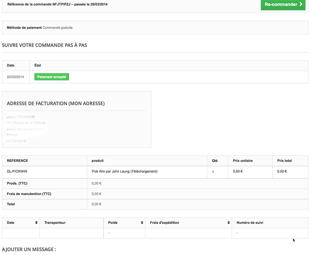 Vincent Terenti Posted March 20, 2014 Share Posted March 20, 2014 Bonjour MagicJu, Vous devez aller dans l'historique des commandes, puis dans la commande en question il y a le lien pour télécharger le produit Bien cordialement, Link to comment Share on other sites More sharing options...