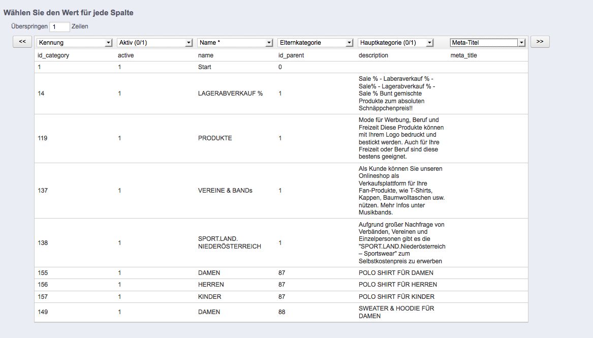 prestamax Posted March 21, 2014 Share Posted March 21, 2014 (edited) Du hast deine CSV Liste falsch gemappt. Du musst schauen, ob deine Spaltenüberschriften in der Tabelle mit den Spaltenüberschriften in Prestashop vor dem Import übereinstimmen. Deine Spalte description ist z.B. auf Hauptkategorie gemappt. Das führt dann zu einer Fehlermeldung. Wenn du auf den Pfeil neben Hauptkategorie klickst, kannst du hier description (bzw. Beschreibung) auswählen, so dass description mit description übereinstimmt. Edited March 21, 2014 by prestamax (see edit history) Link to comment Share on other sites More sharing options...