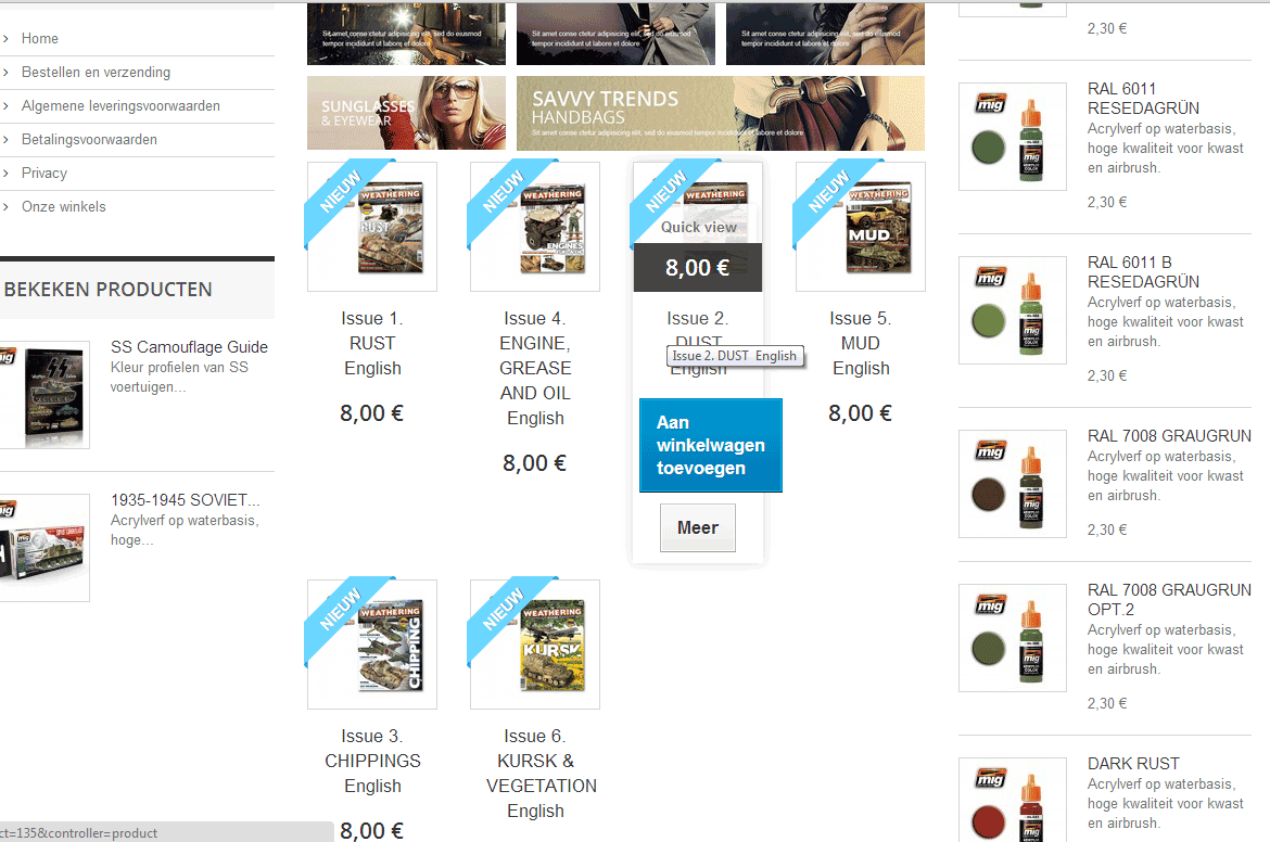 rvzoest Posted April 23, 2014 Share Posted April 23, 2014 Yes, here below is how I it is now. "Aan winkelwagen toevoegen" is "Add to cart". I don't find it esthetic and want it just to be simple and plain. The "Quick view" is fine but I want a fixed add to cart button. Link to comment Share on other sites More sharing options...