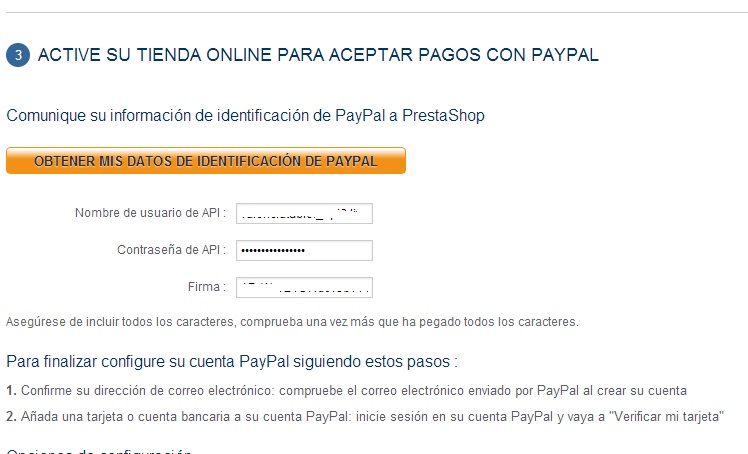 valenciatablet Posted March 26, 2014 Share Posted March 26, 2014 (edited) Hola japarisid, buenos dias!! En algún momento he tenido el problema ése de "Please try contact..." Lo he solucionado así: Una vez dentro del módulo Paypal de PS, y sin introducir ningún dato desde Paypal al módulo, clickeas dónde pone "Obtener mis datos de identificación de Paypal" . Click ahí y tendrás que volver a introducir la contraseña de Paypal. Inmediatamente saltará un diálogo con los datos. Cópialos y pégalos en el módulo dejando el pago express, el modo real y direct sale ACTIVADOS Así lo hice yo siguiendo las instrucciones de un post de aquí y funciona perfecto Espero haberte ayudado! Saludos Edited March 26, 2014 by valenciatablet (see edit history) Link to comment Share on other sites More sharing options...