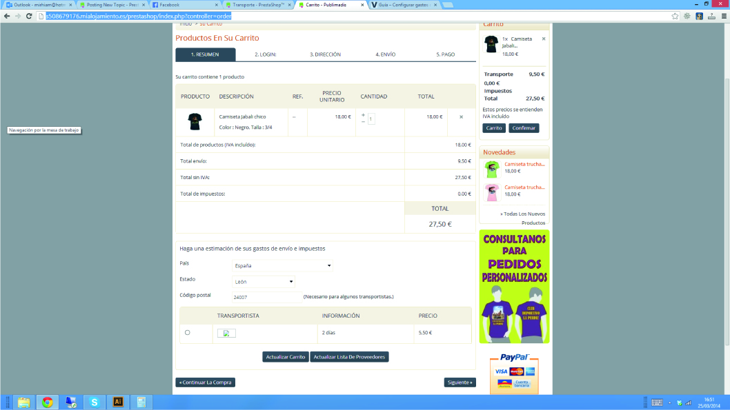 Mirhiam Posted March 25, 2014 Share Posted March 25, 2014 Buenas tardes, Acabo de configurar mis transportistas por zonas en prestashop 1.5.6 y en principio todo ok. Pero al ir al carrito, me aparece directamente unos gastos de envío (9.50€). Después me deja calcular mis gastos de envío por zona, y me sugiere el transportista con el precio adecuado según le pongo unas zonas u otras. Sin embargo, al actualizar el carrito con el transportista correcto no hace nada. Me gustaría que en los gastos de envío no pusiera nada hasta que no eligiera el transportista adecuado según la zona.... Y que cuando le de a actualizar carrito me lo aplique. También me gustaría saber si al configurar los rangos del transportista, se puede poner por precio de 0 a una cantidad grande (por ej. 6.000 €) Es que no no quiero que tenga ningún rango específico ni de precio ni de peso, sino, siempre para esa zona... Link to comment Share on other sites More sharing options...