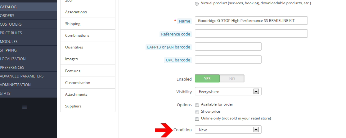 mpouliot34 Posted May 18, 2014 Share Posted May 18, 2014 if you want to remove it from front office - open product.tpl file. then remove this code: {capture name=condition} {if $product->condition == 'new'}{l s='New'} {elseif $product->condition == 'used'}{l s='Used'} {elseif $product->condition == 'refurbished'}{l s='Refurbished'} {/if} {/capture} <p id="product_condition"{if !$product->condition} style="display: none;"{/if}> <label>{l s='Condition'} </label> <span class="editable" itemprop="condition">{$smarty.capture.condition}</span> </p> Thank you very much. After staying up all night last night I had found it already. Thank you so very much for your reply. Link to comment Share on other sites More sharing options...