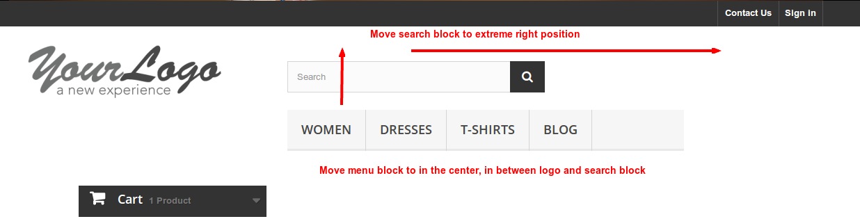 I am doing customisation prestashop 1.6 default-bootstrap theme. For now I have made totally copy the default-bootstrap theme and made the new theme named as custom-theme. So for doing this I will make only changes in the custom-theme, no changes will be done in default-bootstrap theme. So I just activated my theme and as per mockup design I want to move search block to the exterme right of the page and the default category menu will come in the middle part i.e in between logo and search block. So to this I have to change the markup order as per the theme. Because I can see search block div is closed before the block_top_menu. So as per my requirtment I want the logo in left side, menu in center and the search in right side and I want to do this from my theme file. So that I will just put my theme in any installation of prestashop and the changes will come to show.