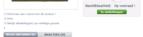 Voodoochild Posted March 27, 2014 Author Share Posted March 27, 2014 Als ik op de rechter muisknop naar de bron van de pagina kijkt, zie ik het volgende stukje code waar het dat cijfer 1 staat... <!-- MODULE MailAlerts --> <input type="text" id="oos_customer_email" name="customer_email" size="20" value="[email protected]" class="mailalerts_oos_email" onclick="clearText();" /><br /> <a href="#" onclick="return addNotification();" id="mailalert_link">Meld mij zodra (weer) beschikbaar</a> <span id="oos_customer_email_result" style="display:none;"></span> <!-- END : MODULE MailAlerts --> </p> <p class="warning_inline" id="last_quantities" style="display: none;" >Let op: dit is de laatste op voorraad!</p> <p style="display: none;" id="add_to_cart" class="buttons_bottom_block"><input type="submit" name="Submit" value="In winkelwagen" class="exclusive" /></p> <div class="clear"></div> </form> </div> </div> 1 <!-- description and features --> <div id="more_info_block" class="clear"> <ul id="more_info_tabs" class="idTabs idTabsShort"> <li><a id="more_info_tab_more_info" href="#idTab1">Meer informatie</a></li> Heb alle files op de server doorgelopen maar heb het niet gevonden.. Voel me net de matrix...zie allemaal cijfertjes als ik in me nest ligt.. Link to comment Share on other sites More sharing options...