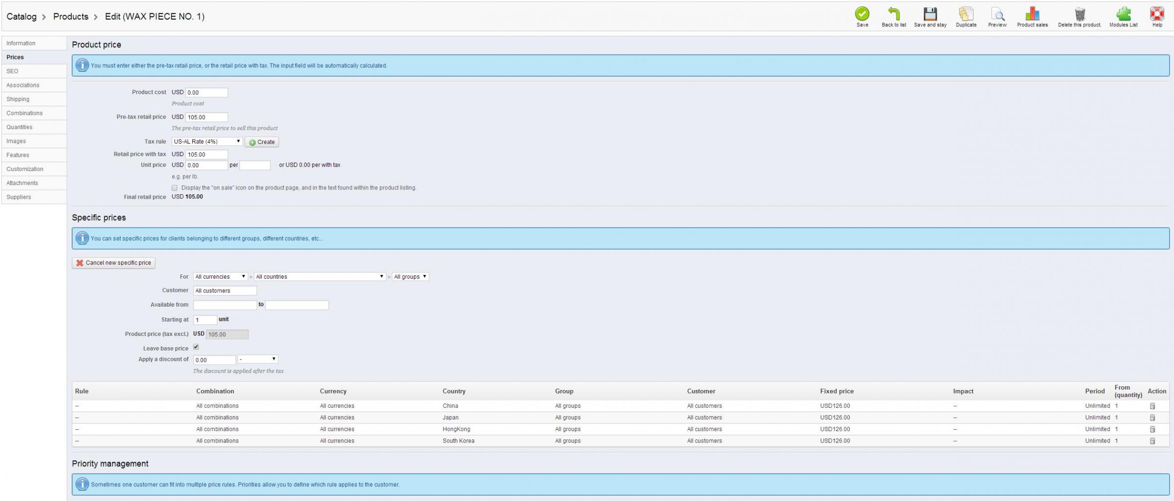 El Patron Posted March 27, 2014 Share Posted March 27, 2014 current specific price does not support this, there are some mass discount modules that help...see official addon's...I use and some of my customers use module called 'mass discounter' you may also find this of interest: http://www.prestashop.com/forums/topic/193843-module-prestashop-geo-pricing-geo-target-specific-prices-by-country/ happy geo targeting Link to comment Share on other sites More sharing options...