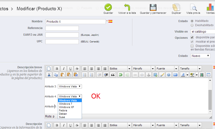 xabikip Posted March 27, 2014 Share Posted March 27, 2014 En cuanto al funcionamiento interno de prestashop no cambia en la versión 1.6. En esta nueva versión los cambios son mas que nada visuales. En cuanto a los atributos a mi tampoco me gusta como los trata prestashop. Debería de haber una opción de crear atributos virtuales, que no te generen una combinación donde puedas ponerle distinto precio ni nada, que solo sea una característica opcional mas de articulo, sin que esta afecte al stock, ni precio, ni nada. A ver si en futuras versiones lo tienen en cuenta. 2 Link to comment Share on other sites More sharing options...