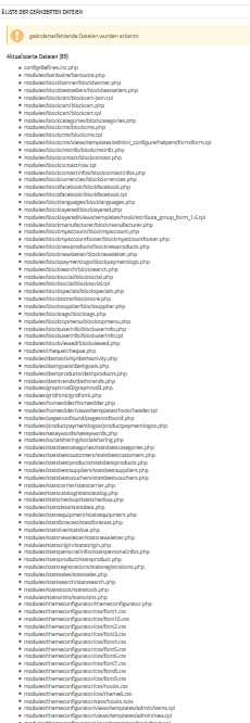 blu21 Posted March 27, 2014 Share Posted March 27, 2014 Hallo Folgende fragen ( PS1.6) Im Admin unter Erweiterte Einstellungen - System Einstellungen Taucht bei ein ! bild auf mit Liste der geanderten Dateien Aktualisierte Datein ( 89) geänderte/fehlende Dateien wurden erkannt Aktualisierte Dateien (89) config/defines.inc.php modules/bankwire/bankwire.php modules/blockbanner/blockbanner.php modules/blockbestsellers/blockbestsellers.php modules/blockcart/blockcart-json.tpl modules/blockcart/blockcart.php modules/blockcart/blockcart.tpl modules/blockcategories/blockcategories.php modules/blockcms/blockcms.php modules/blockcms/blockcms.tpl modules/blockcms/views/templates/admin/_configure/helpers/form/form.tpl modules/blockcmsinfo/blockcmsinfo.php modules/blockcontact/blockcontact.php modules/blockcontact/nav.tpl modules/blockcontactinfos/blockcontactinfos.php modules/blockcurrencies/blockcurrencies.php modules/blockfacebook/blockfacebook.php modules/blockfacebook/blockfacebook.tpl modules/blocklanguages/blocklanguages.php modules/blocklayered/blocklayered.php modules/blocklayered/views/templates/hook/attribute_group_form_1.6.tpl modules/blockmanufacturer/blockmanufacturer.php modules/blockmyaccount/blockmyaccount.php modules/blockmyaccountfooter/blockmyaccountfooter.php modules/blocknewproducts/blocknewproducts.php modules/blocknewsletter/blocknewsletter.php modules/blockpaymentlogo/blockpaymentlogo.php modules/blocksearch/blocksearch.php modules/blocksocial/blocksocial.php modules/blocksocial/blocksocial.tpl modules/blockspecials/blockspecials.php modules/blockstore/blockstore.php modules/blocksupplier/blocksupplier.php modules/blocktags/blocktags.php modules/blocktopmenu/blocktopmenu.php modules/blockuserinfo/blockuserinfo.php modules/blockuserinfo/blockuserinfo.tpl modules/blockviewed/blockviewed.php modules/cheque/cheque.php modules/dashactivity/dashactivity.php modules/dashgoals/dashgoals.php modules/dashproducts/dashproducts.php modules/dashtrends/dashtrends.php modules/graphnvd3/graphnvd3.php modules/gridhtml/gridhtml.php modules/homeslider/homeslider.php modules/homeslider/views/templates/hook/header.tpl modules/pagesnotfound/pagesnotfound.php modules/productpaymentlogos/productpaymentlogos.php modules/sekeywords/sekeywords.php modules/socialsharing/socialsharing.php modules/statsbestcategories/statsbestcategories.php modules/statsbestcustomers/statsbestcustomers.php modules/statsbestproducts/statsbestproducts.php modules/statsbestsuppliers/statsbestsuppliers.php modules/statsbestvouchers/statsbestvouchers.php modules/statscarrier/statscarrier.php modules/statscatalog/statscatalog.php modules/statscheckup/statscheckup.php modules/statsdata/statsdata.php modules/statsequipment/statsequipment.php modules/statsforecast/statsforecast.php modules/statslive/statslive.php modules/statsnewsletter/statsnewsletter.php modules/statsorigin/statsorigin.php modules/statspersonalinfos/statspersonalinfos.php modules/statsproduct/statsproduct.php modules/statsregistrations/statsregistrations.php modules/statssales/statssales.php modules/statssearch/statssearch.php modules/statsstock/statsstock.php modules/statsvisits/statsvisits.php modules/themeconfigurator/themeconfigurator.php modules/themeconfigurator/css/font1.css modules/themeconfigurator/css/font10.css modules/themeconfigurator/css/font2.css modules/themeconfigurator/css/font3.css modules/themeconfigurator/css/font4.css modules/themeconfigurator/css/font5.css modules/themeconfigurator/css/font6.css modules/themeconfigurator/css/font7.css modules/themeconfigurator/css/font8.css modules/themeconfigurator/css/font9.css modules/themeconfigurator/css/hooks.css modules/themeconfigurator/css/theme6.css modules/themeconfigurator/sass/hooks.scss modules/themeconfigurator/views/templates/admin/items.tpl modules/themeconfigurator/views/templates/admin/new.tpl modules/themeconfigurator/views/templates/hook/hook.tpl Was soll mir das jetzt sagen gut schlecht unwichtig ? Für infos wäre ich dankbar LG Blu21 Link to comment Share on other sites More sharing options...