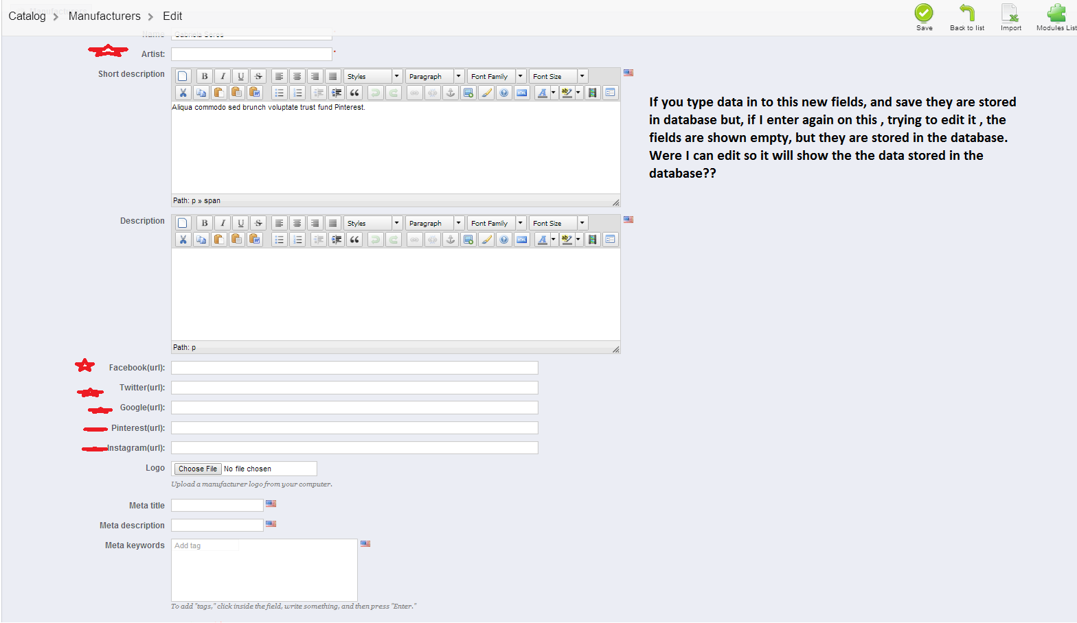 dumad Posted March 28, 2014 Share Posted March 28, 2014 (edited) Hello, I added some new fields to the manufacturer edit page, the data that you enter in this fields is saved in the database, but after you save and close the page, if I enter again on this , trying to edit it , the fields are shown empty, but they are stored in the database. Were I can edit so it will show the the data stored in the database?? PrestaShop 1.5.6.2 Thank you. Edited March 28, 2014 by dumad (see edit history) Link to comment Share on other sites More sharing options...
