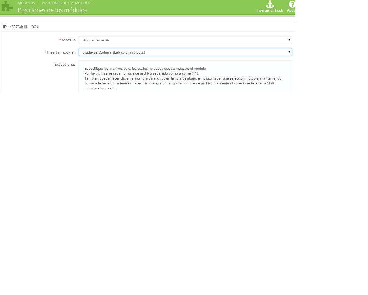 valenciatablet Posted April 1, 2014 Share Posted April 1, 2014 Hola barqui y gaston1985, buenas tardes!! Los módulos pueden volver a colocarlos insertando un "hook". Por ejemplo, yo uso Ps 1.6 y quiero añadir un hook del carrito a la columna izquierda. Entonces hago lo de la foto adjunta. Elijo el "hook" (en éste caso sería Bloque de carrito) y lo inserto en la columna izquierda eligiendo DisplayLeftColumn(left column block). Así aparecerá, seguramente debajo dle todo, en la columna izquierda. Recuerda siempre elegir el que pone "column block" Link to comment Share on other sites More sharing options...