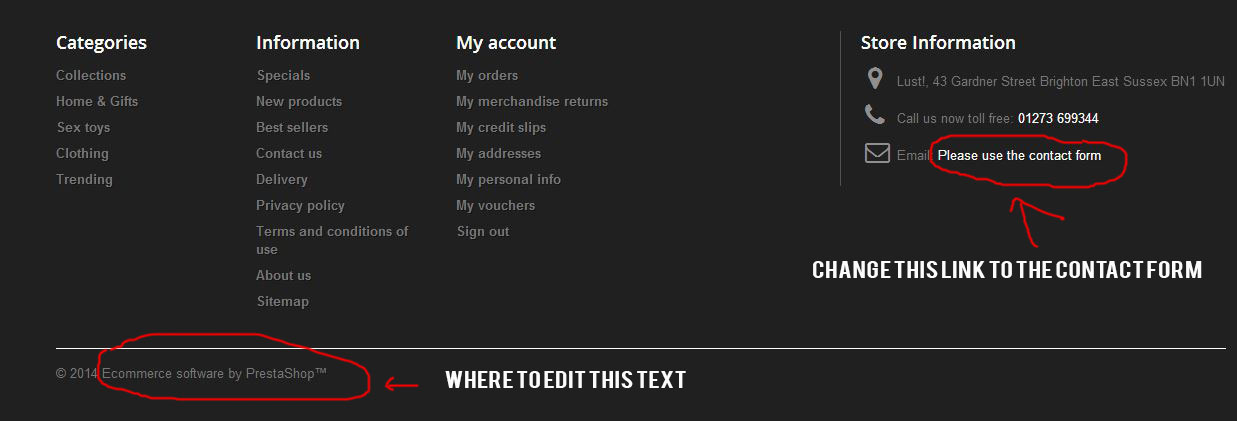 giallofanatic Posted April 2, 2014 Author Share Posted April 2, 2014 regarding to the copyright text: themes/default-bootstrap/modules/blockcms/blockcms.tpl there is a code like: <section class="bottom-footer col-xs-12"> <div> © 2014 {l s='[1]Ecommerce software by %s[/1]' mod='blockcms' sprintf=['PrestaShop™'] tags=['<a class="_blank" href="http://www.prestashop.com">']} </div> </section> Thanks Vekia, that's just what I was looking for. Do you have any idea on the other issue by any chance? 2. I would like to edit the email link in the store information block so that it directs the customer to the contact form. I think this is better than visibly displaying the store email address. Thanks Chris Link to comment Share on other sites More sharing options...