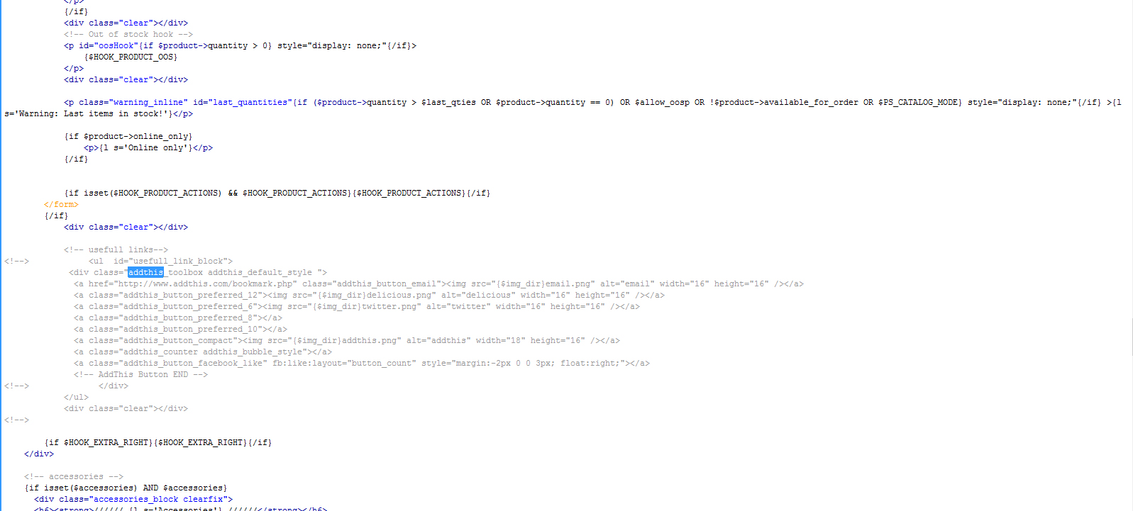 slyme1979 Posted April 2, 2014 Author Share Posted April 2, 2014 hello i suppose that this is some kind of non default module or this is hardcoded in your product.tpl file if i were you - i will verify it. open product.tpl file and search for "addthis" Hi Vekia, I did that before posting here, still the links appeared(Please kindly see attached. Should i just delete the whole chunk?). Am at wits end... Anyway thanks for the reply. Best Regards, Jay. Link to comment Share on other sites More sharing options...