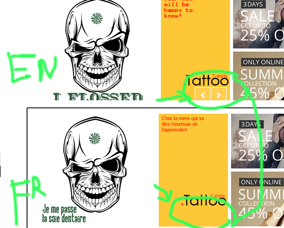 lemarcgagnon Posted April 2, 2014 Share Posted April 2, 2014 Bonjour! (English will follow) Pour le module " Configure "Image slider for your homepage" module" les flèches de navigation apparaissent sans problème sur les images lorsqu'on met à jour le texte et les images en anglais. Cependant, les flèches disparaissent en français! augh! Alors.... Comment on les fait apparaître pour cette langue aussi? j'imagine que cela est valable pour les autres langues que l'anglais, Hi! When we update the "Configure "Image slider for your homepage" module" image for another language, the navigation arrows in the image do not appear in the new language. How do we fix this? Yours, Merci Marc Configure "Image slider for your homepage" module Link to comment Share on other sites More sharing options...