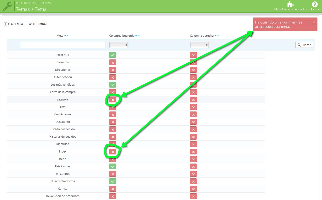Después de actualizar a la versión 1.6,  estoy utilizando el tema por defecto "default-bootstrap" y me percato de que no muestra el módulo de categorías en la columna de la izquierda, me voy a preferencias -> temas e intento activarlo para la columna de la izquierda pero me da el errór que se ve en el pantallazo "Ha ocurrido un error mientras se actualizaba esta meta".