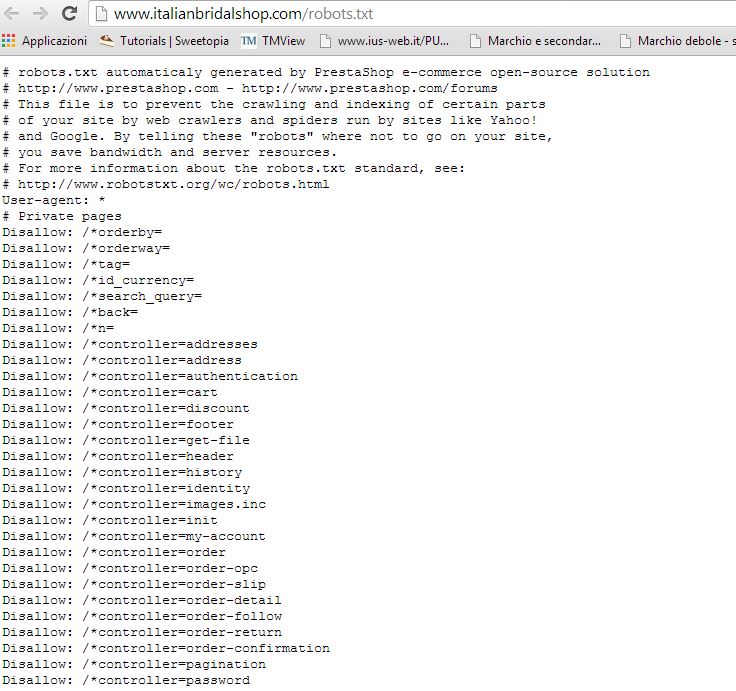 elenaba Posted April 7, 2014 Share Posted April 7, 2014 (edited) Hi Is there anybody that can explain me what is my error ? New installation PS 1.6.5 http://italianbridalshop.com Installed Google sitemap module and submitted the sitemap to google in my webmaster tool page. Google gave me an error message writing that: googlebot can't come in to the website because file robot.txt didn't allowed it. Have I to change something in this file ? What is the exact position of this file ? Google sent me a link to my file robot and this is what I look: Edited April 7, 2014 by elenaba (see edit history) Link to comment Share on other sites More sharing options...