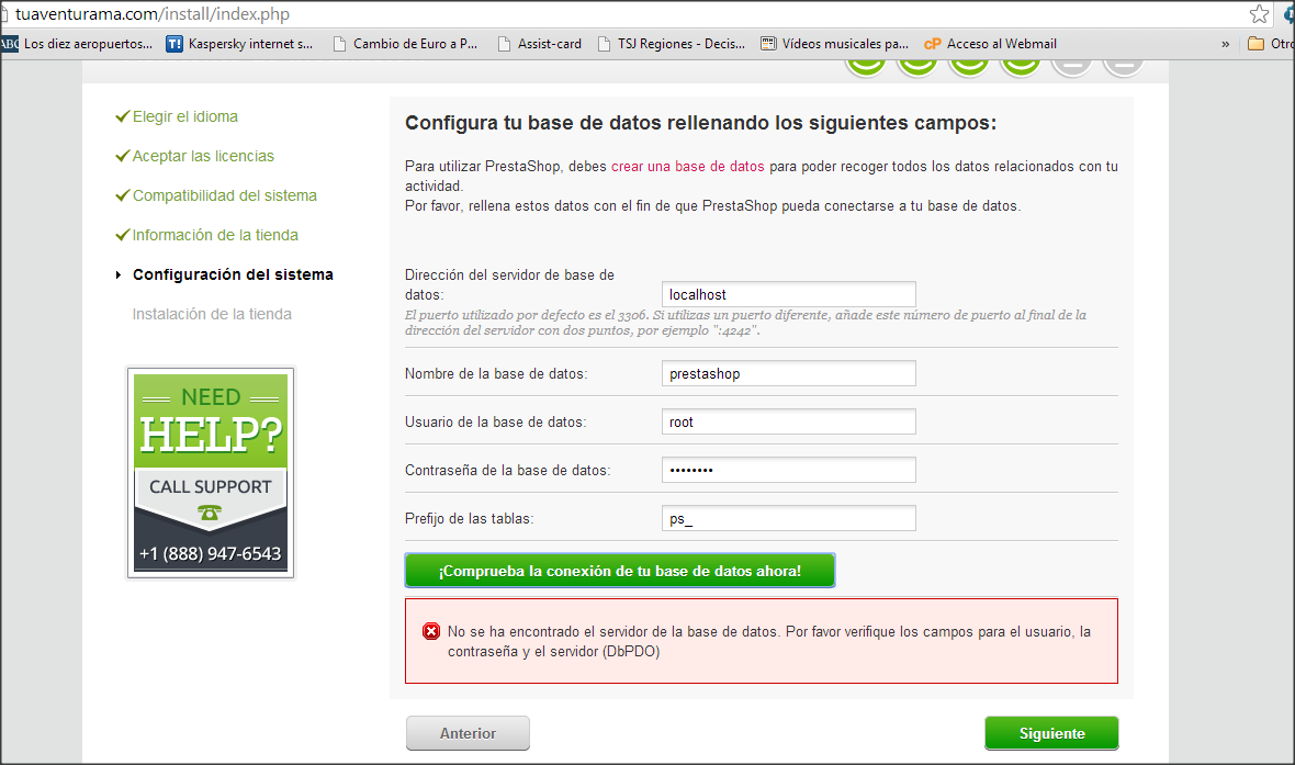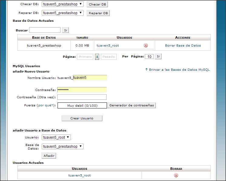 cesar761 Posted April 8, 2014 Author Share Posted April 8, 2014 (edited) Los datos que estas colocando para conectarte a la base de datos no son correctos. En la captura, que adjuntas de la instalación, dices: Usuario de la base de datos: root y en la pantalla grafica que adjuntas, la segunda dice: tuaven5_tuaven5 Y en base de datos, en la captura de instalación colocas: prestashop cuando en la segunda captura, dice que tiene que ser: tuaven5_prestashop Luego donde dice: servidor de base de datos, has colocado localhost, que suele ser lo que se coloca habitualmente, aunque en algunos hosting no siempre es asi, si te fijas en la parte superior de phpmyadmin, veras si dice localhost u otra cosa, normalmente ya te digo que es localhost Resuelto muchas gracias Edited April 8, 2014 by cesar761 (see edit history) Link to comment Share on other sites More sharing options...