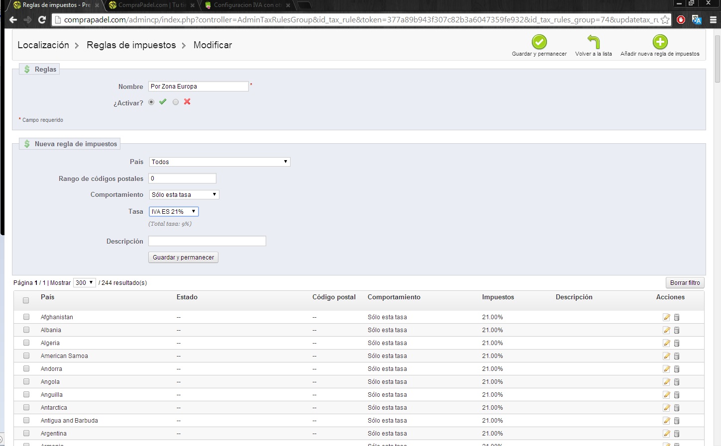 Si pero como puedes ver en la tercera, tengo otra regla creada para el resto de la zona europea con todos los paises, aplicandole el 21%.