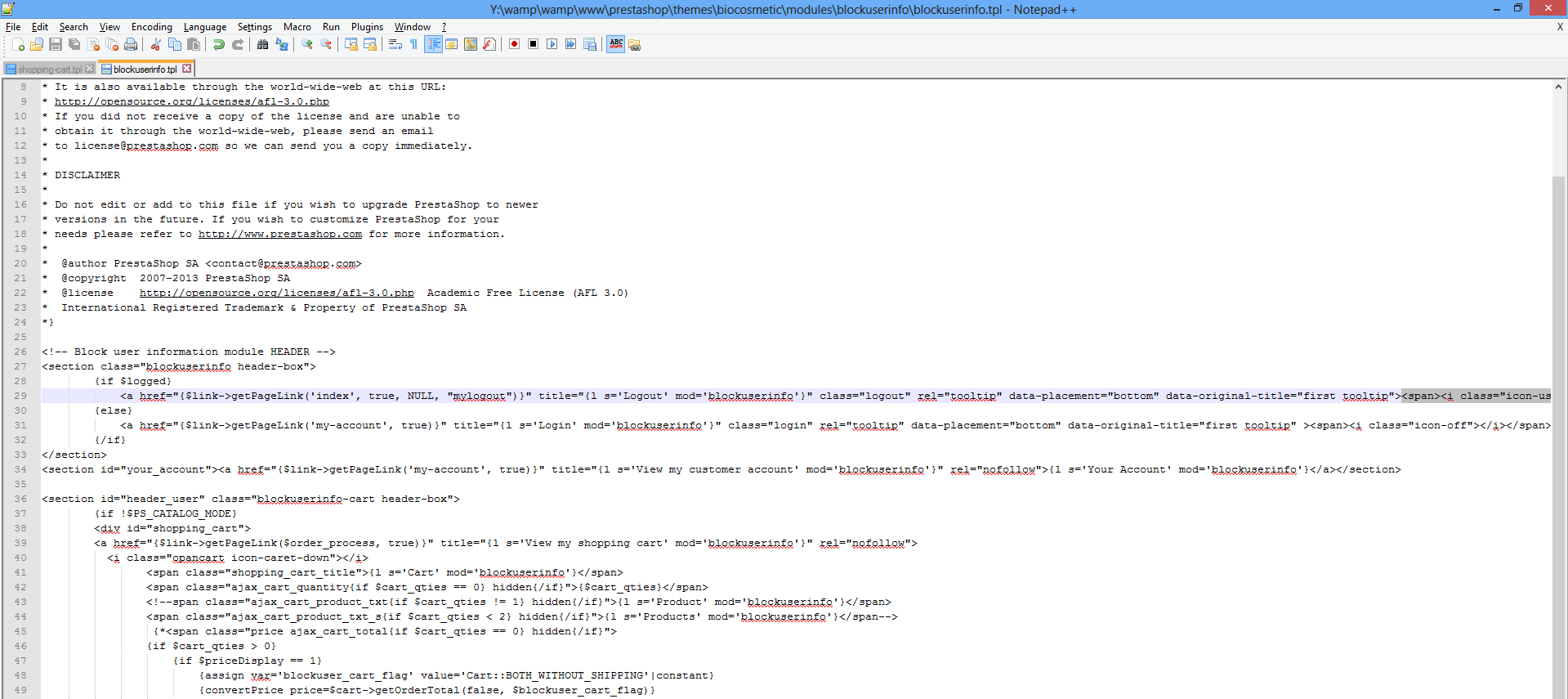 wartex11 Posted April 10, 2014 Share Posted April 10, 2014 Hey guys, Just looking for a bit of coding help, I really like the new prestashop default theme, and how when a customer signs in it shows their name top right hand corner as attached: I would really like to add it to my biocosmetic theme, as it is quite confusing if the person is logged in or not, is this a simple task? I have located the code where I think I should input it in the blockuserinfo.tpl Any help would be appreciated, Thanks Link to comment Share on other sites More sharing options...