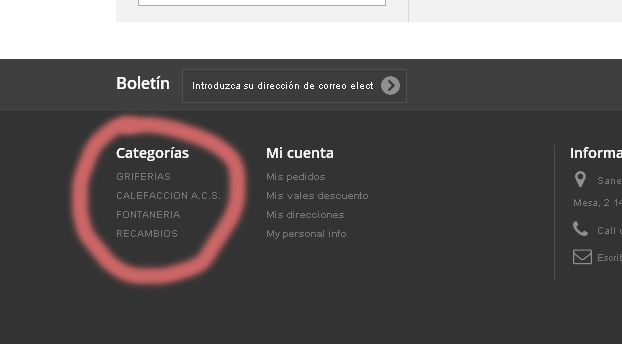 saneamador Posted April 10, 2014 Share Posted April 10, 2014 Hola haber si me echais una mano necesito modificar o hacerlo bien, (por que antes salia con la que viene por defecto, pero borre todo tal como indica el manual) y ahora no puedo o no ser poner para que el catalogo de categorias me salga donde pone inicio y si puedo modificar el texto de inicio por otro, Explicarmelo como si fuera un niño de cuatro años(jejejej), que no estoy muiy puesto con esto todavia. os pongo unas fotos y detallo mas o menos por si no me entendeis. Version 1.6 1º en el pic consulta: donde pone inicio me sale : Entrega Aviso Legal....... Pues ahi es donde quiero que me salga lo de las categorias que tengo puestas. 2º en el pic consulta 1: estas son las categorias que tengo creadas pero quiero que al menos me salgan las principales, las subcategorias si se pueden mejor, en donde pone inicio en el pic anterior. Espero haberme explicado bien, os doy las gracias de antemano. un saludo. www.saneamador.es Link to comment Share on other sites More sharing options...