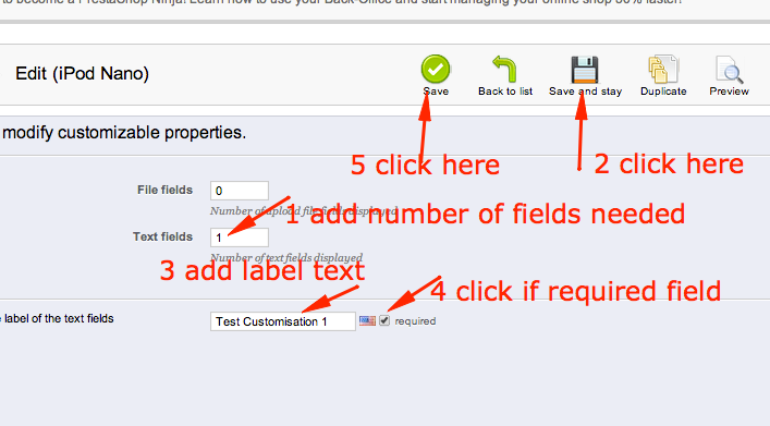 PascalVG Posted April 12, 2014 Share Posted April 12, 2014 Do you mean the standard customisation field? If so, then all this is standard possible: Do this: - go to the product you want to add the customisation field to in back office (catalog->products, edit product) - Click on "Customization" tab. - see picture, do stap 1 - 5 - Go to front office. Select product. - see picture, do stap 1-4 (N.B. after adding the product to the cart, if you hover over your shopping cart, you see the product and the customisation is mentioned here as well) Go to checkout. In the summary, you see the product and the customisation mentioned. Hope that's what you needed, pascal. Link to comment Share on other sites More sharing options...