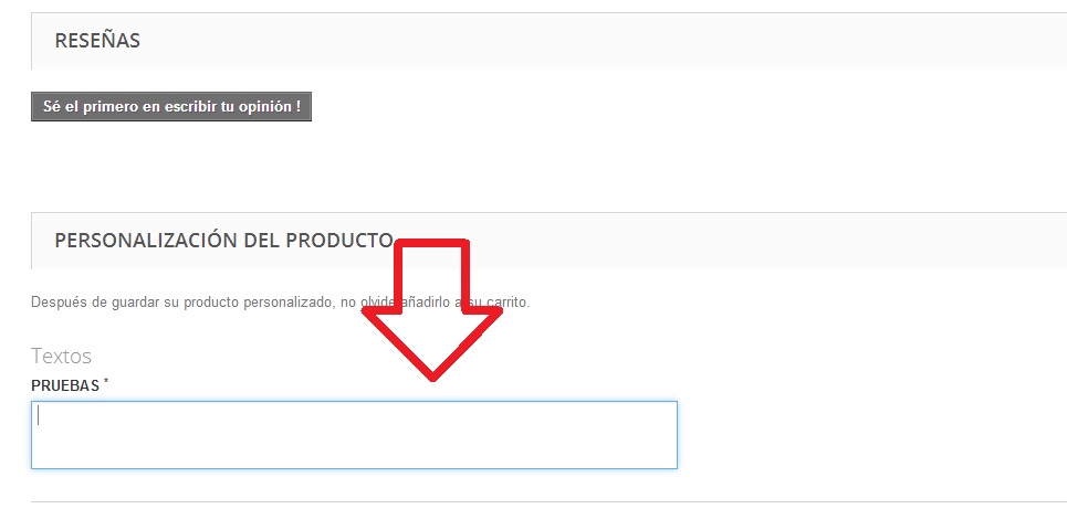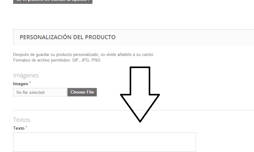 ijosse Posted April 11, 2014 Share Posted April 11, 2014 Hola.Quisiera que al realizar una compra de un articulo pudiera añadirle el cliente el fichero que quiere enviarme.Para ello hago lo siguiente: AÑADIR O MODIFICAR PROPIEDADES DE PERSONALIZACIÓNCampo de texto: 1y le pongo un nombre adjuntar fichero: Pruebas Y lo pongo como campo requerido.Sin embargo al realizar el pedido, no me aparece la opción de seleccionar el fichero a subir.¿?sabeis que puede estar sucediento, la primera vez que lo hice si que me aparecia correctamente. Link to comment Share on other sites More sharing options...