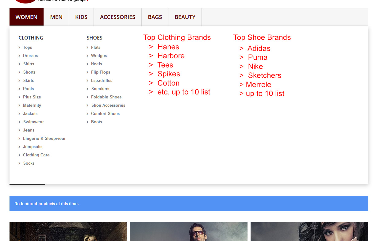 eliwebworks Posted April 12, 2014 Share Posted April 12, 2014 Anybody please who can enlighten me, on how to solve this problem: ** I have 6 Different parent Categories; Women, Men, Kids, Accessories, Bags and Beauty. and for each categories it had sub-categories like in Women; it had Clothing sub-category and Shoes sub-category which is displayed on its submenu, what I want is to add another column for the top brands/supplier for Clothing and Top brands/supplier for Shoes under the women Category. and goes on same with the other parent categories. see the attached pictures bellow: what could the best possible solution coding for this. Thanks Link to comment Share on other sites More sharing options...