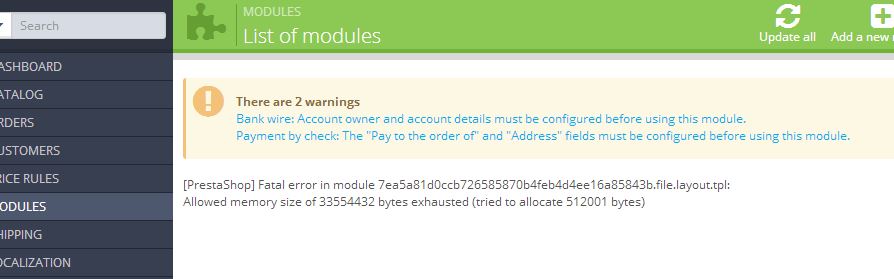vasan82 Posted April 13, 2014 Share Posted April 13, 2014 I am getting the below message . I tried to update the modules even then i am getting the same message . Kindly advise . [PrestaShop] Fatal error in module 7ea5a81d0ccb726585870b4feb4d4ee16a85843b.file.layout.tpl:Allowed memory size of 33554432 bytes exhausted (tried to allocate 512001 bytes) Kindly find the attachments . Thanks Keerthi Link to comment Share on other sites More sharing options...