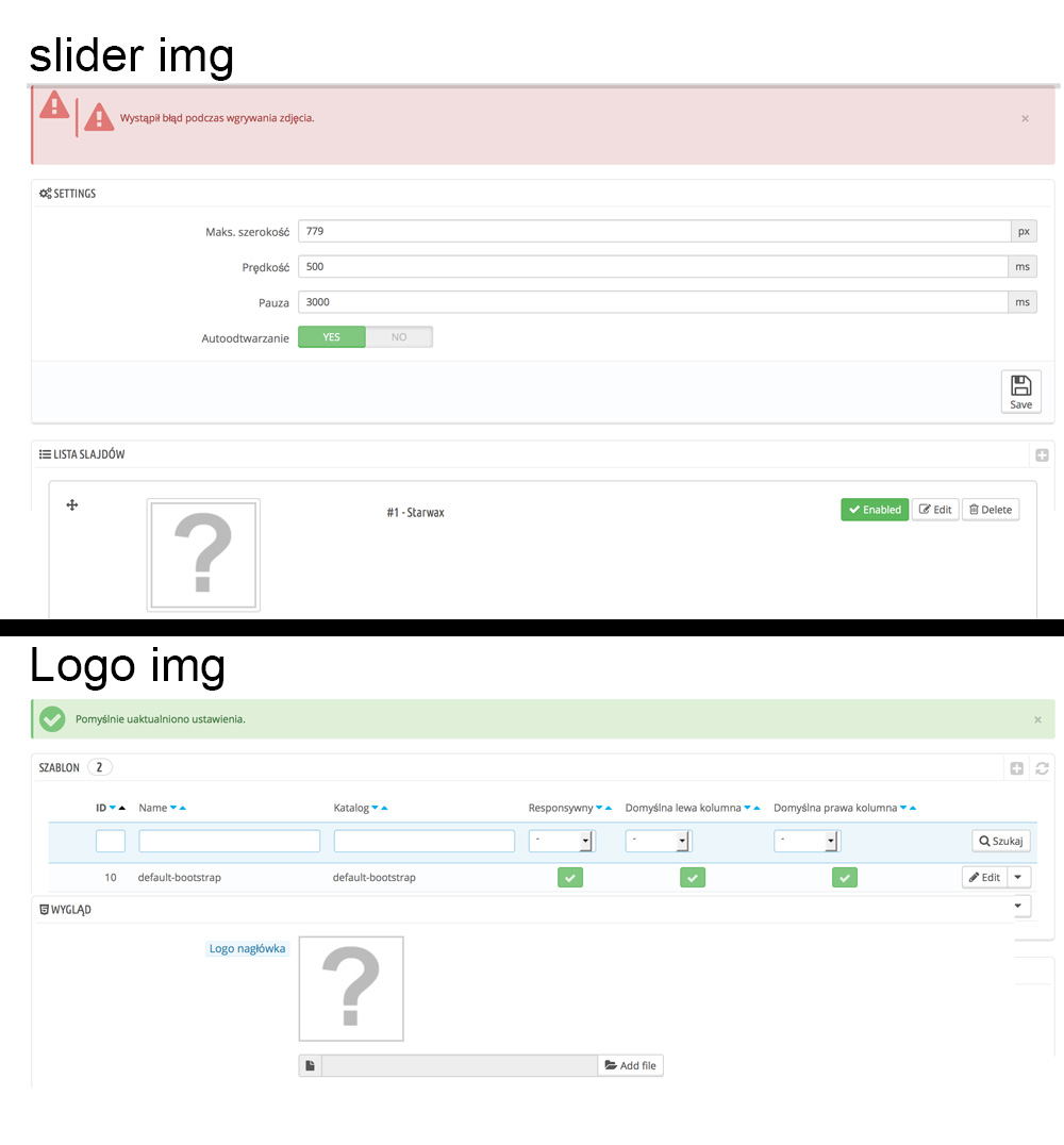 4play Posted April 14, 2014 Share Posted April 14, 2014 Hi I have problem with update images in new prestashop 1.6. I have default theme. 1. I try change logo in heder. When I change image in admin panel appear information in green box update successful but insted logo I have "?" image. 2. When i try change image in slider (module slider) - appera red box with error information and I have "?" image in slider. Somthing is wrong with image update in my presta but I dont have idea what. Any suggestions? Link to comment Share on other sites More sharing options...