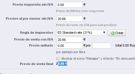 pegasus6464 Posted April 15, 2014 Share Posted April 15, 2014 (edited) Buenas tengo un jaleo aqui El caso es que tenia todos los precios bien, con el precio final, el iva correspondiente ... Y ahora me aparece todo sin iva es decir me sale precio base , iva y precio de venta con el mismo importe (el precio sin el iva descontado) Quizas fue porque anduve editando zonas geograficas y quite españa y la volvi a poner no se El caso mas raro es que si entro en el backoffice los precios salen los dos (precio base y precio con iva) mal, pero desde el Store manager me sale bien, pero si le doy a vista previa del producto vuelve a aparecerme el precio sin iva Alguien puede echarme una mano? Estoy desesperao En la foto como veis estan los dos precios igual, me lo han fastidiado al migrar de servidor, que puedo hacer para recuperar y aplicar los iva? vaya cosa mas rara joer ... _( Edited April 15, 2014 by pegasus6464 (see edit history) Link to comment Share on other sites More sharing options...
