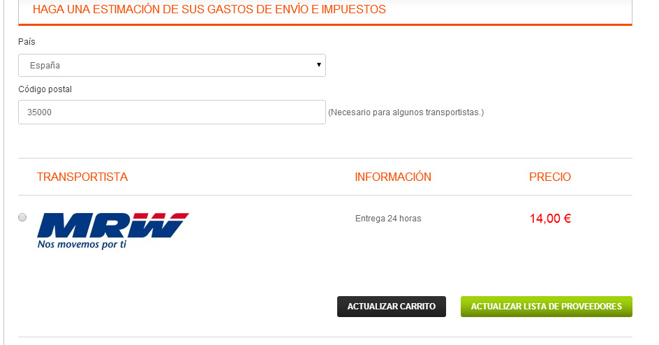 cartuchalia Posted April 15, 2014 Share Posted April 15, 2014 Yo en transportista tengo para todos los sitios al mismo precio. Tendrias que ir a transporte -> transportista y crear un transportista nuevo. Le pones el nombres, logo url y zona, y seleccionas a que zona va a trabajar ese transportista. A continuación lo que hacer es ir a transporte -> transporte y donde pone 'Tasas en función del transportista, zona geografica y rangos' seleccionas el transportista y el precio para cada zona que tenga designada. Espero que me explicara bien. Link to comment Share on other sites More sharing options...