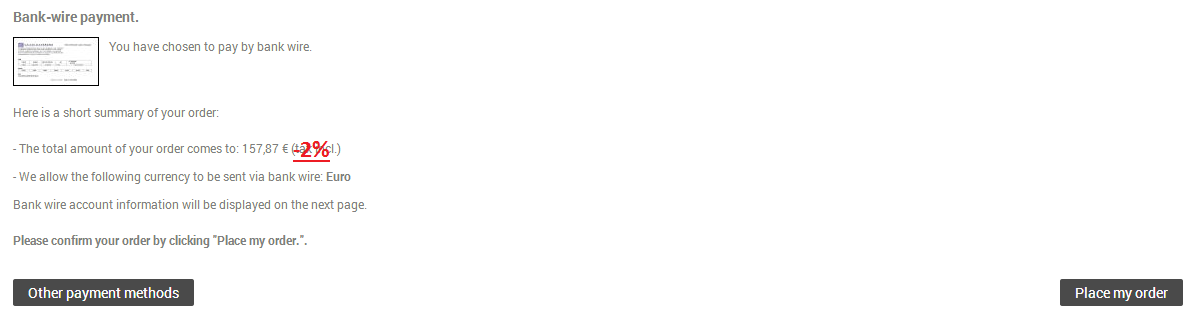 Marino1988 Posted April 16, 2014 Share Posted April 16, 2014 Hello.I am using prestashop version 1.5.6.0. I want to add a extra discount to a payment but dont know how.I want to add an extra 2% discount for every user that pay by banwire.The 2% discount should be visible after they chose the bankwire payment method. So the last step in the order summary.See picture for more details.As you see in the picture the is now the sum of 157,87 but i want it here to be -2% of the whole sum coz it should be like a little reward if you pay by bankwire.I am not sure how to do this but i am quite sure a have to edit some lines in the prestashop-modules-bankwire-controlers-front-payment.php. But i cant seem to get i working.The code in this .php is: <?php class BankwirePaymentModuleFrontController extends ModuleFrontController { public $ssl = true; public function initContent() { $this->display_column_left = false; parent::initContent(); $cart = $this->context->cart; if (!$this->module->checkCurrency($cart)) Tools::redirect('index.php?controller=order'); $this->context->smarty->assign(array( 'nbProducts' => $cart->nbProducts(), 'cust_currency' => $cart->id_currency, 'currencies' => $this->module->getCurrency((int)$cart->id_currency), 'total' => $cart->getOrderTotal(true, Cart::BOTH), 'this_path' => $this->module->getPathUri(), 'this_path_bw' => $this->module->getPathUri(), 'this_path_ssl' => Tools::getShopDomainSsl(true, true).__PS_BASE_URI__.'modules/'.$this->module->name.'/' )); $this->setTemplate('payment_execution.tpl'); } } ?> I have tried something like: <?php $discount = "($total * 2) / 100" ?> And changed the var in the payment_execution.tpl from {displayPrice price=$total} To: {displayPrice price=$discount} But then i dont get any number is the filed.So does anyone have an idea how can i slove this problem?Best regards. 1 Link to comment Share on other sites More sharing options...