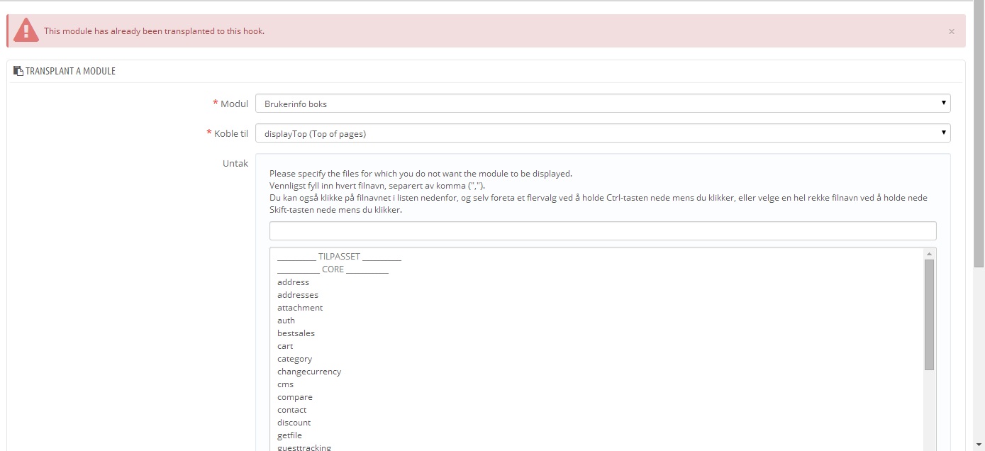 OCP Posted April 18, 2014 Author Share Posted April 18, 2014 go to modules > postiions click on green translant button and try to transplant module: blockuserinfo to dispalyTop hook If I am doing it right, I get this error: "This module has already been transplanted to this hook." Link to comment Share on other sites More sharing options...