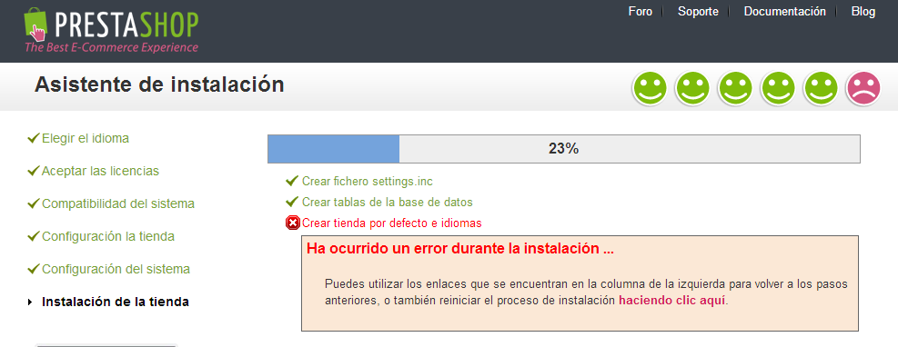 userval Posted April 22, 2014 Share Posted April 22, 2014 Hola chicos: Estaba decidido a instalarme la versión 1.6.0.6 desde cero y estoy teniendo un problema en el paso de "Configuración del sistema". El proceso donde salta el error es el de "Crear tienda por defectos e idiomas" (23%). He descargado el programa varias veces y también lo he borrado y subido al servidor, para descartar fallos en la integridad de la distribución. Pero que nada, que me quedo ahí. Conecta con la base de datos, sí, todo guay..pero se me queda colgado y no sé qué puedo hacer... Agradezco toda ayuda Gracias de antemano! Link to comment Share on other sites More sharing options...