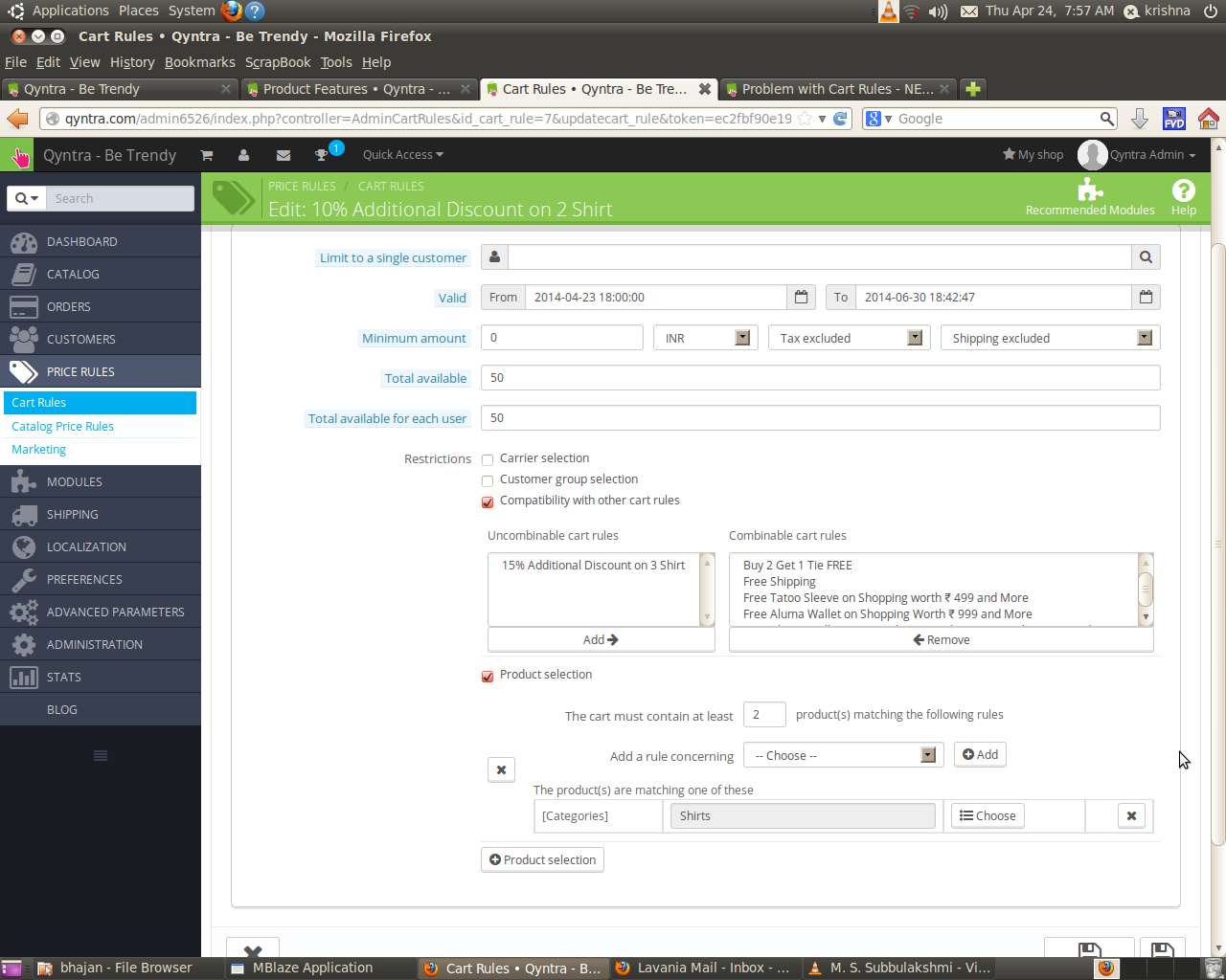 jprr773 Posted April 23, 2014 Share Posted April 23, 2014 (edited) Dear, I have created two cart rules as follows 1. on category Ties but 2 get 1 free 2. on category Shirts buy 2 get 10% additional discount. what is happening when 1 have 2 shirts in cart and other items and apply discount code it is applied to all products in place of Shirts only. my site is http://qyntra.com Thanks DId you setup the cart rule with «Product selection»/«categories»? Edited April 23, 2014 by jprr773 (see edit history) Link to comment Share on other sites More sharing options...