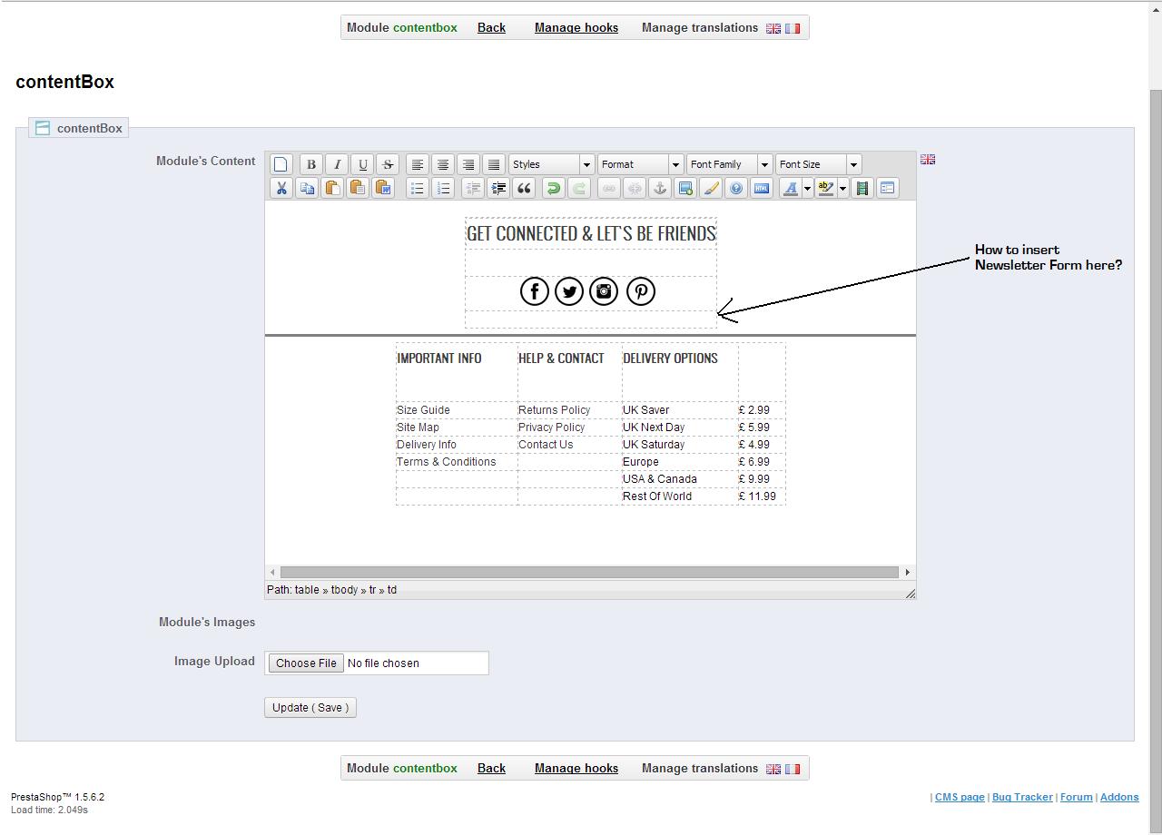fyonline Posted April 24, 2014 Share Posted April 24, 2014 Hello everyone, I need to add the newsletter form into an HTML block. Anyone can show me how to do it ! HTML Module: contentBOX Newsletter Module: Prestashop Prestashop Version: 1.5.6.2 Ive added a table in that HTML module and I want the newsletter form inside that table. Please help me to achieve it. Anyone can help? Thank You. Link to comment Share on other sites More sharing options...