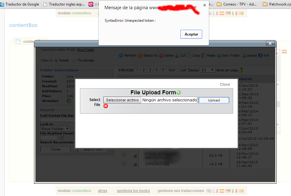 jonysi_d Posted April 24, 2014 Share Posted April 24, 2014 (edited) Tengo un problema al subir fotos al servidor mediante este modulo " CONTENTBOX " o desde los CMS de prestashop al intentar poner una foto. Este error me aparece despues de darle a " Upload ". Me sale error de : SyntaxError: Unexpected token: os adjunto una captura del error ... alguna sugerencia de porque este tipo de error ?? gracias Edited April 24, 2014 by jonysi_d (see edit history) Link to comment Share on other sites More sharing options...
