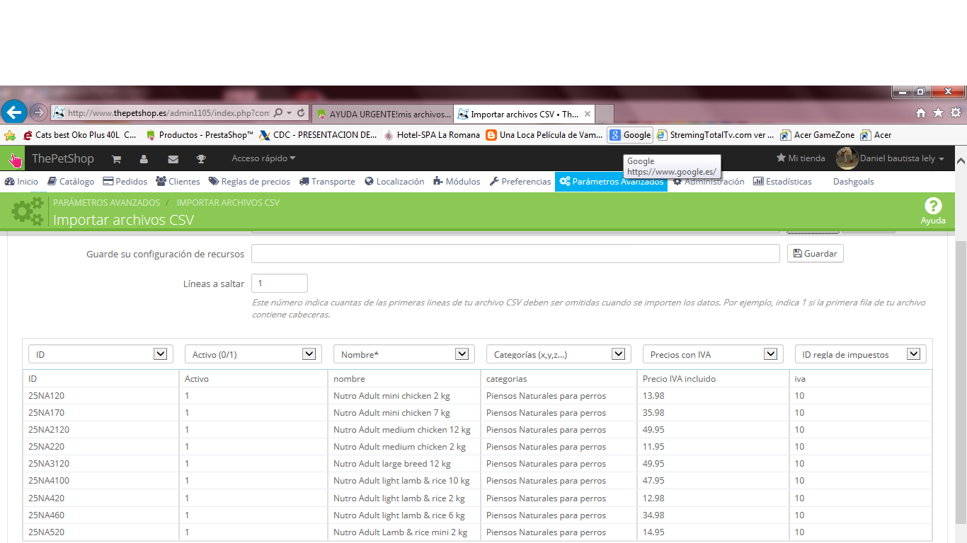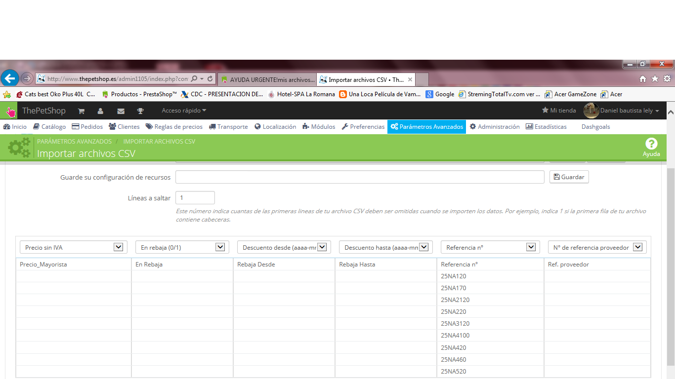 ThePetShop Posted April 24, 2014 Author Share Posted April 24, 2014 Hola, ¿Puedes subir un ejemplo del fichero que estás intentando importar? lo siento pero no me deja, me dice que no tengo permiso para subir ese tipo de archivos, ni xls ni csv Link to comment Share on other sites More sharing options...