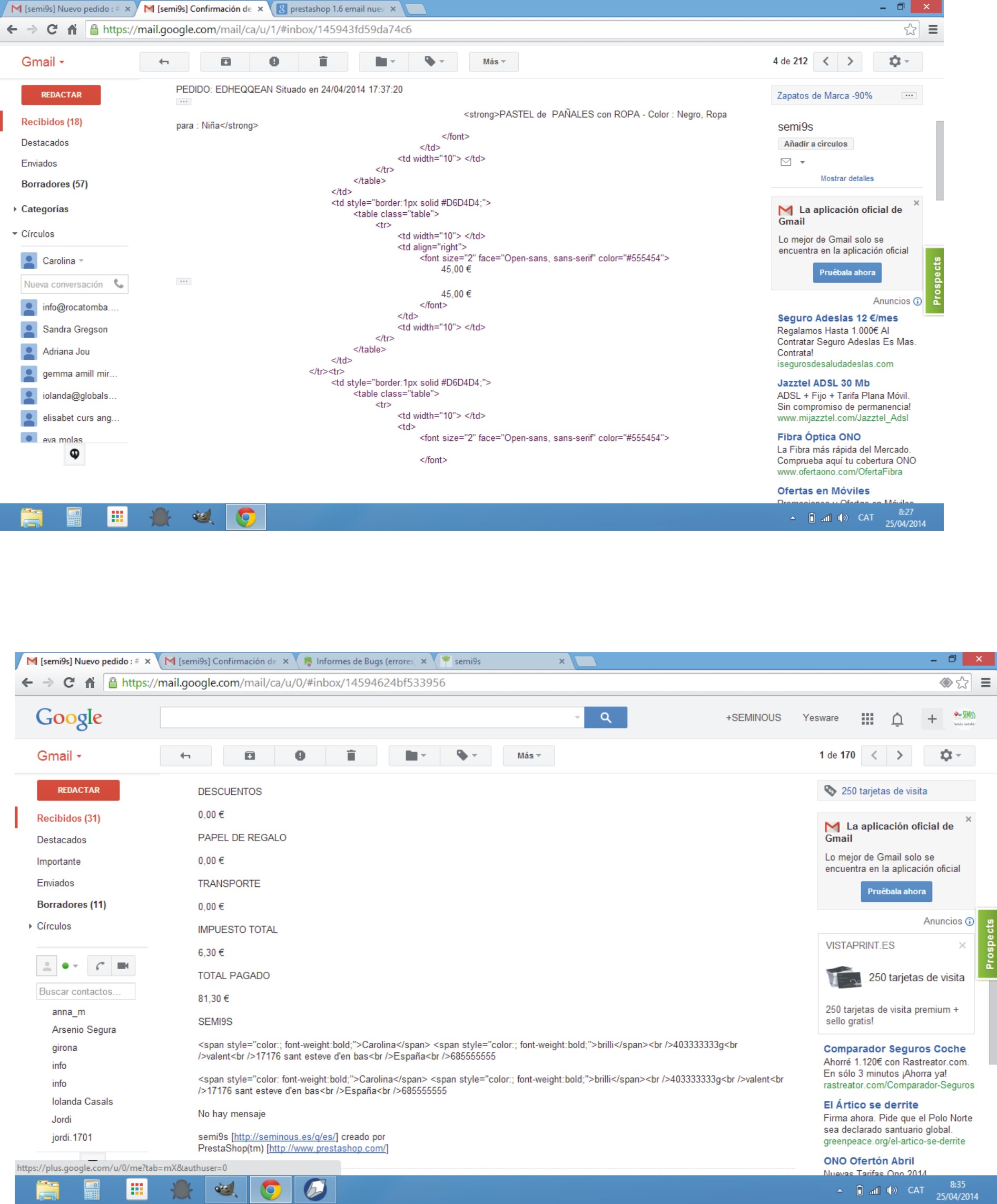 seminous Posted April 25, 2014 Share Posted April 25, 2014 Buenos días Tengo un pequeño problema que no se como solucionar. Los e mail que manda por ejemplo de confirmación de pedido al cliente y a mi dirección de correo. Salen con un código. Dejo imagen para ver. No se si tengo algo desconfigurado. Pero queda muy mal cuando recibes un mail así. Gracias de antemano Me olvidé. Versión 1.6 Link to comment Share on other sites More sharing options...