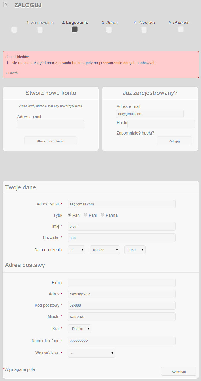 "Nie można założyć konta z powodu braku zgody na przetwarzanie danych osobowych."