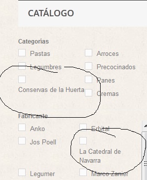 alamagar Posted April 27, 2014 Share Posted April 27, 2014 (edited) Hola, ¿Es posible hacer que el bloque de marcas se muestre en la homepage pero no en las paginas de categorías? Es decir quiero que en la homepage la columna izquierda tenga el bloque de marcas y en las categorías dicha columna contenga la navegación por facetas. Cómo la navegación por facetas ya discrimina por marcas en las categorías la selección por marcas es redundante. Otra pregunta, ¿se puede hacer algo más ancha la columna izquierda? las categorías y marcas en la navegación por facetas aparecen en dos columnas y algunos nombres largos se dividen en dos líneas. Adjunto imagen para que se entienda mejor. Una última, ¿Puede cambiarse el orden en la navegación por facetas? es decir que la slide de precio salga como primera selección por ejemplo. Gracias de antemano!! Edited May 7, 2014 by alamagar (see edit history) Link to comment Share on other sites More sharing options...